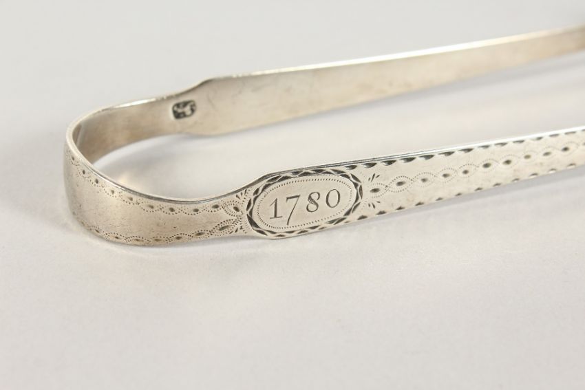 A PAIR OF GEORGIAN BRIGHT CUT SILVER SUGAR TONGS. Dated 1780. Maker J. J.