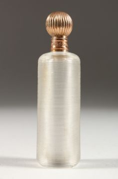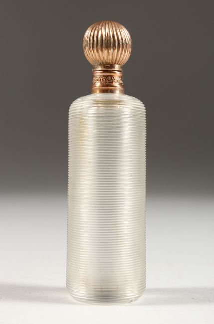 A CUT GLASS SCENT BOTTLE with gold top, in a fitted case.