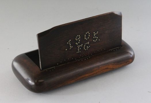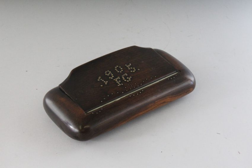 AN OVERSIZED FOLK ART TABLE SNUFF BOX with studded brass top.