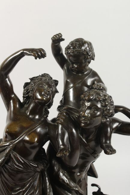 A SUPERB 19TH CENTURY BRONZE OF TWO CLASSICAL FIGURES and TWO YOUNG CHILDREN, on an oval sienna marble base.