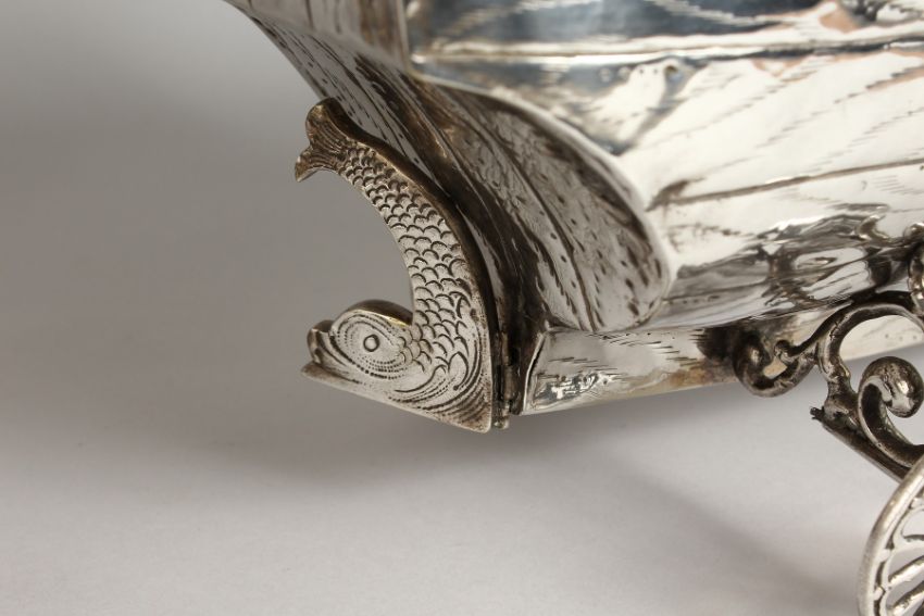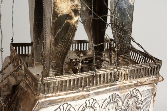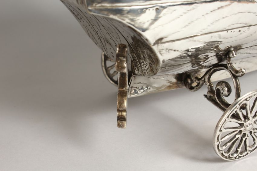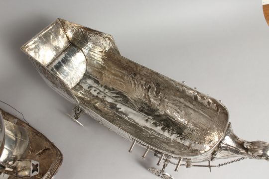 A SUPERB LARGE .800 CONTINENTAL SILVER NEF, the top with three main sails, various figures, the base with bird's head figurehead. The body with repousse with cupids, supported on four wheels. 30ins high x 21ins long.