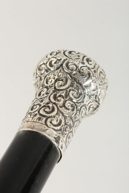 A GEORGE V SILVER TOP WALKING CANE, repousse with scrolls.