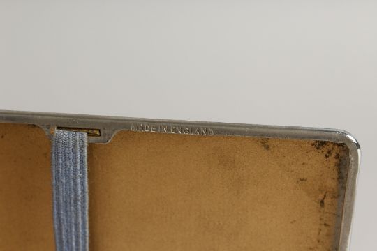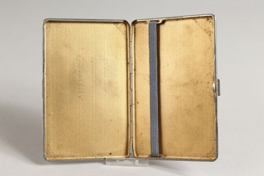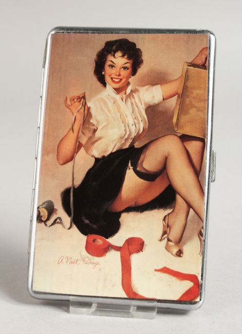 A METAL ENGINE TURNED CIGARETTE CASE. the top with a glamour model with a ribbon.