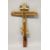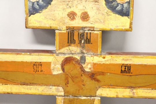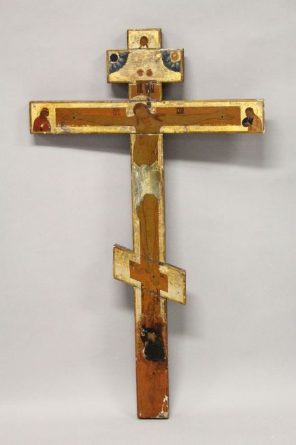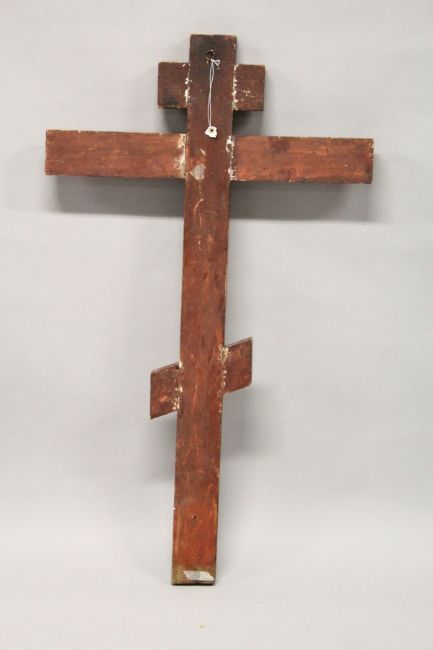 A LARGE 18th / 19th CENTURY RUSSIAN ORTHODOX PAINTED WOODEN DOUBLE SIDED THREE BAR CROSS.