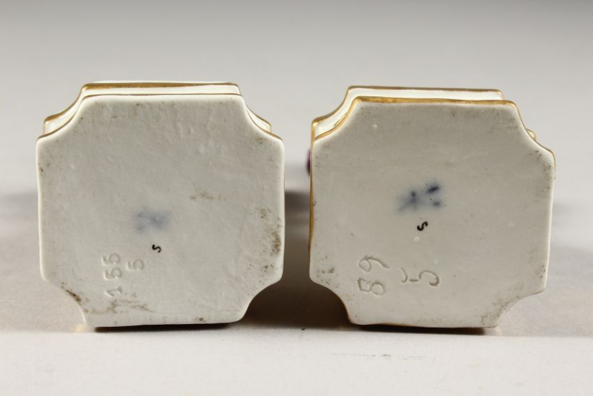 A GOOD SMALL PAIR OF DRESDEN BUSTS ON FIXED STANDS of a man and woman.