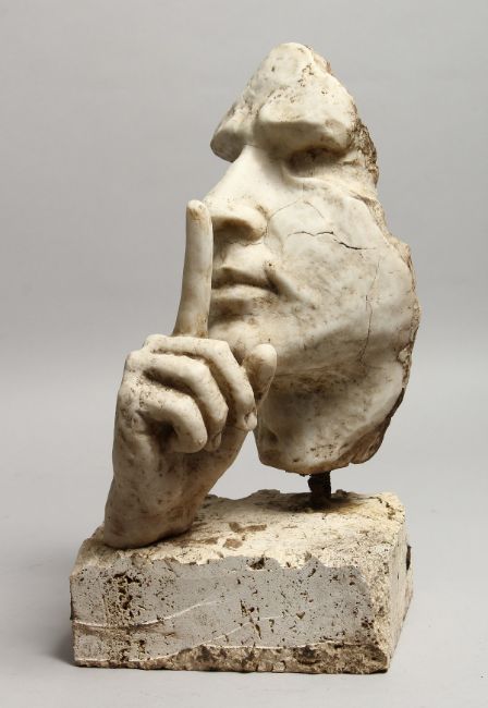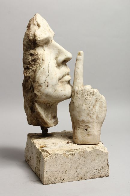 AN ITALIAN CARVED WHITE MARBLE FACE WITH A HAND.
