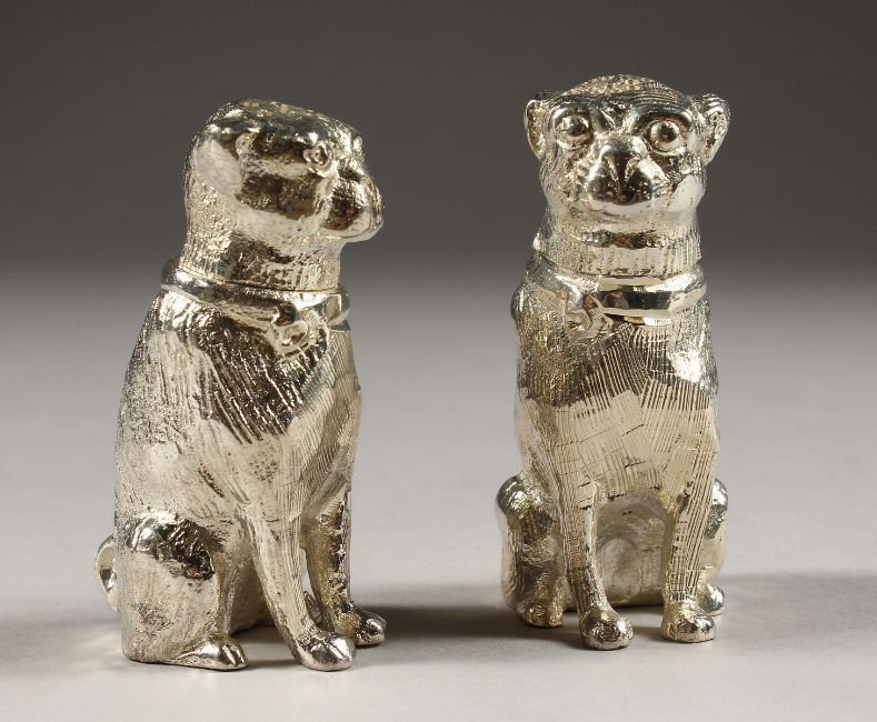 A PAIR OF SILVER PLATE DOG SALT AND PEPPERS.
