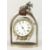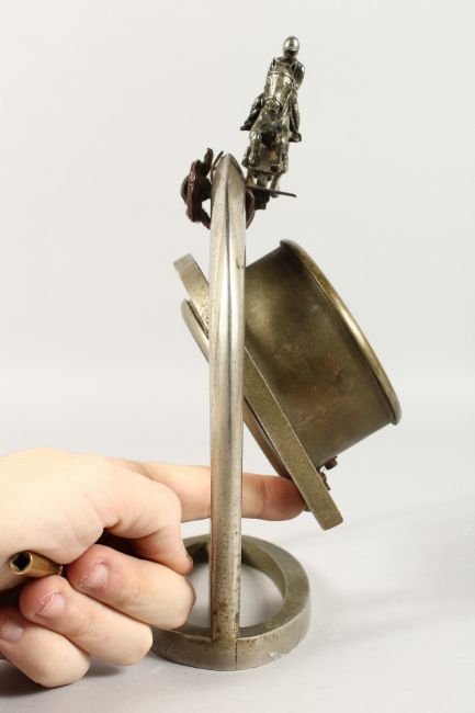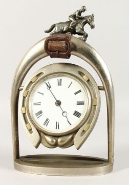 A GOOD METAL EQUESTRIAN CLOCK, as a horseshoe hung between stirrups.