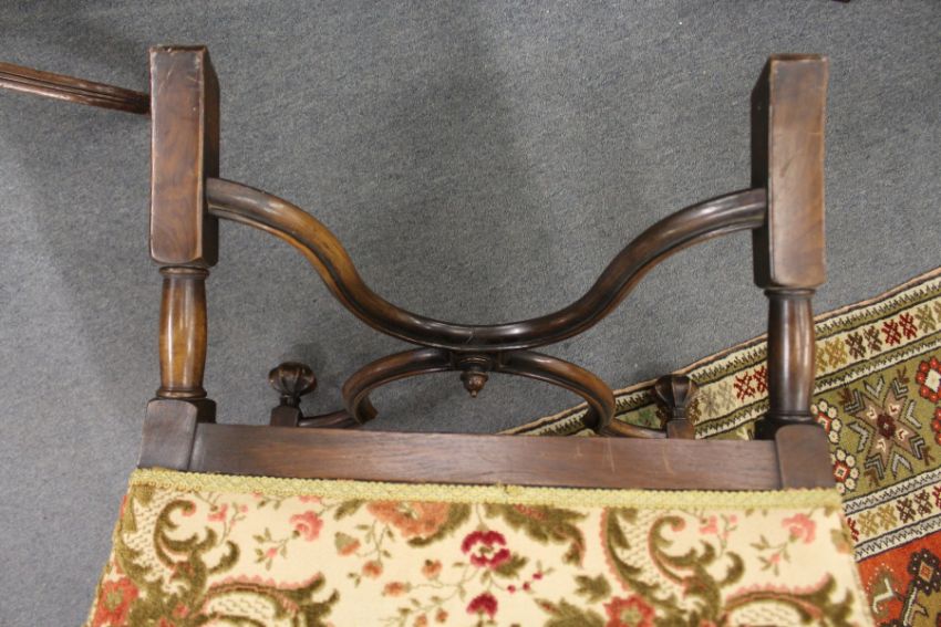 An Elizabethan revival upholstered walnut framed armchair with carved legs united by an X-shaped stretcher.