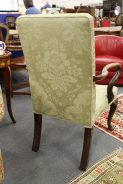 A George III style walnut framed open armchair with upholstered back and seat and shepherd's crook arms.