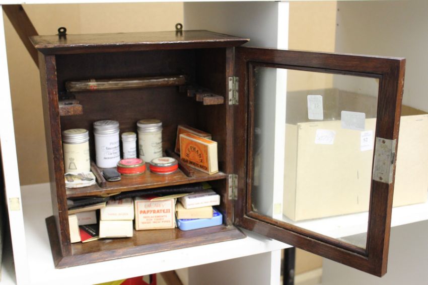 A smoker's cabinet containing snuff and other tobacco related items.