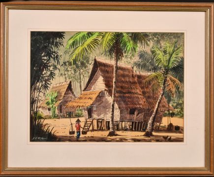 A. B. Ibrahim (1925-1977) Malaysian, figures and chickens before a traditional house on stilts, watercolour, signed, 10.5" x 14".