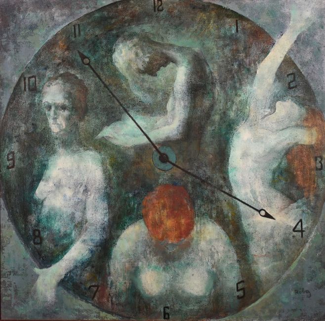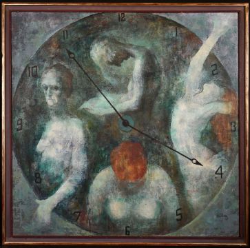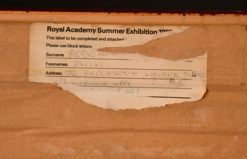 Zsuzsi Roboz (1926-2012) Hungarian, 'The Bewitching Hour', signed with Royal Academy Summer exhibition label verso, oil on canvas, 40" x 40".