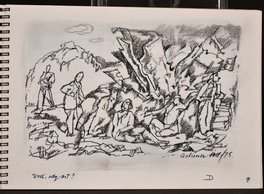 Adrian Hill, a sketchbook of various landscape scenes, charcoal, variously inscribed and annotated, signed 'Sketch book Adrian Hill', dated '1975', sketchbook dimension 8" x 12".