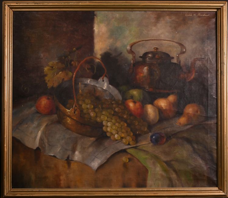 Carl Holger Fischer (1885-1955) Danish, A still life of mixed fruit and copper on a tabletop, oil on canvas, signed, 25" x 29".
