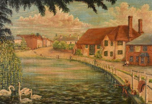 Burns (20th century) British, A View of a town pond with swans and figures, oil on board, signed, 21.5" x 28".