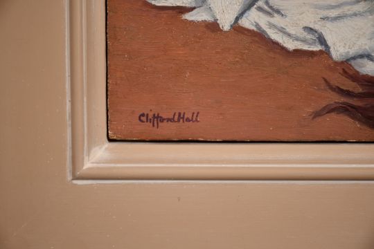 Clifford Hall (1904-1973) British, Study of a female figure wrapped in a towel covering her face, oil on board, signed, 5" x 8".