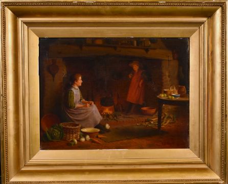 Henry Edward Spernon Tozer (1864-1955) British, scene of a country cottage interior with figures by a fire, oil on canvas, signed and indistinctly dated, 12" x 16".