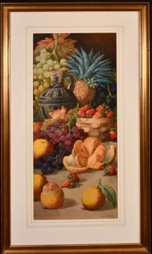 Giovanni Barbaro (1864-1915) Italian, A still life of various fruit and a vessel with lion motif, watercolour, signed, 28" x 12".