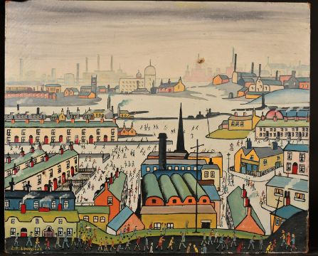 After Lowry, A scene of figures by a factory with a town beyond, oil on canvas, bears signature, 20" x 24", (unframed).