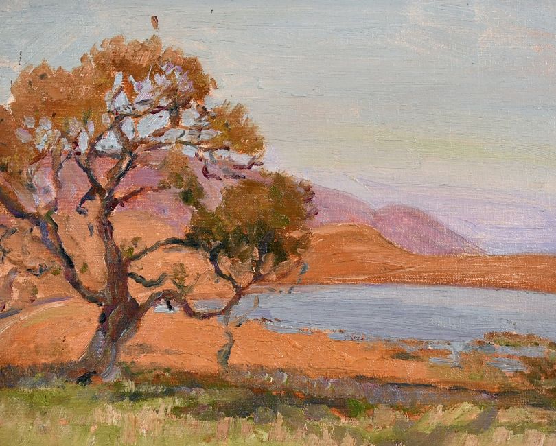 20th century school, A continental Coastal scene with a tree and wildflowers, oil on board, 8" x 10".