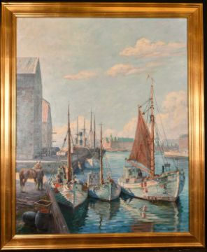 Robert Panitzsch (1879-1949) Danish, fishing boats moored on a quay with a city beyond, probably Copenhagen, oil on canvas, signed and dated '40', 39.5" x 32".
