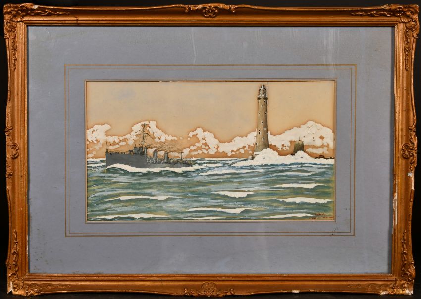 W. J. Lewis (20th Century) A scene of a battleship leaving port, watercolour, signed and dated, 8" x 13.5".