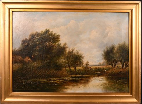 Joseph Thors (1835-1884) Dutch, figures by a riverbank with cattle in a distant landscape, oil on canvas, signed, 20" x 28".