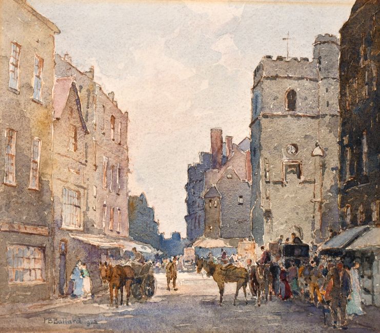 P.B. Ballard, A bustling street scene with figures and carriages, watercolour, signed and dated '1923', 11" x 12.5", (unframed).