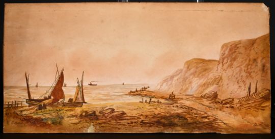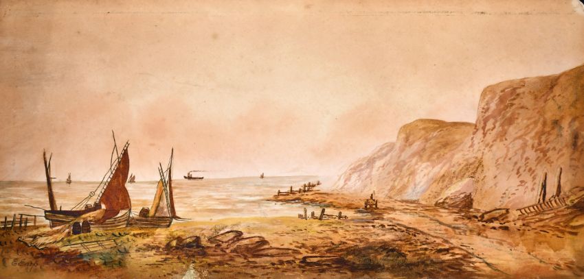 Edwin Earp (1851-1945) British, A coastal scene with boats, watercolour on board, signed, 9.5" x 19.5", (unframed).