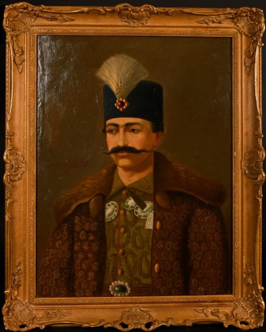Jafar, circa 1875, Persian, A Portrait of Naser al-Din Shah Qajar (1831-1896), signed and dated AH 1292 (1875), oil on canvas, 27.5" x 19.5", Provenance: Mathis Gallery.