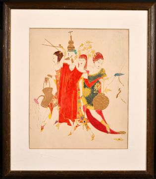 Elyse Ashe Lord (1900-1971) British, 'War Workers, Gardeners and Chimney Sweeps', A pair of scenes of elegant ladies, watercolour, gouache and pencil, Provenance: lot 328, Bloomsbury Auctions, 12th Feb 2014, each 17" x 14", (2).