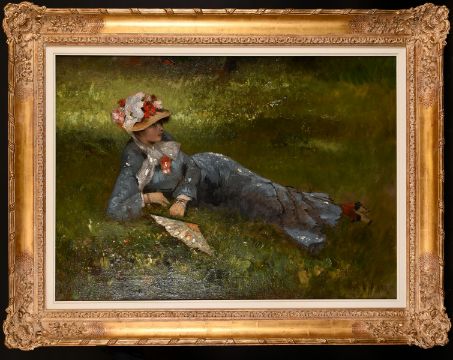 Octave Alfred Saunier (1842-1889) French, and elegant lady relaxing in the garden amongst wildflowers, oil on canvas, signed, 27.5" x 40".