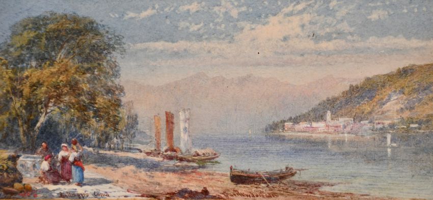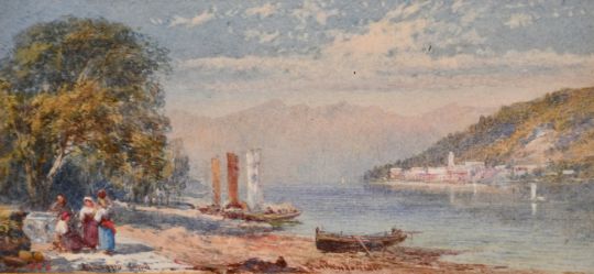 Charles Rowbotham (1856-1921) British, A pair of landscapes of figures standing on the shores of Lake Como with the town of Bellagio beyond, watercolour, signed, dated and inscribed, both, 3" x 9.25".