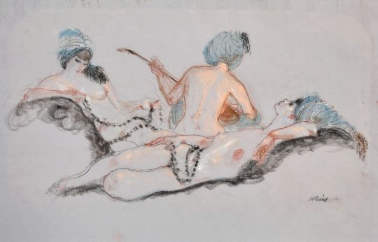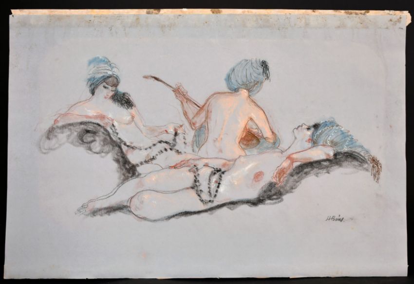 Henry Bird (1909-2000) British, A group of ladies posed as if in a harem, coloured chalks on blue paper, signed in pencil, 10" x 17.5".