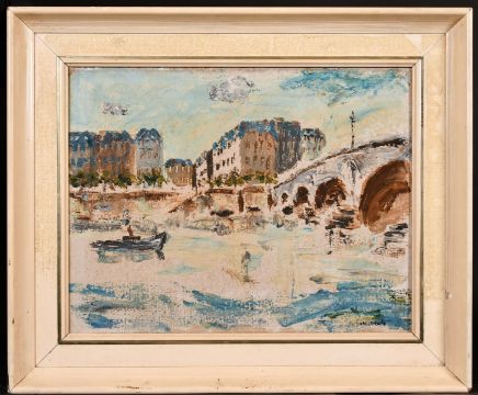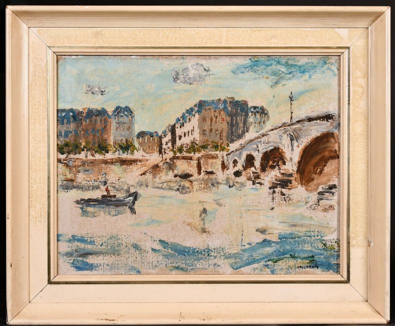 Julian Melgrave (20th century British), 'Port Marie', A view on the river Seine, oil on canvas, signed and inscribed verso, 14" x 18".