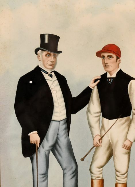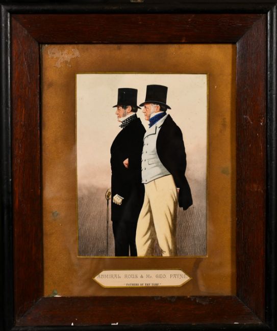 19th century English school, 'Honour and Talent', a portrait of Lord Falmouth and Fred Archer, along with 'Fathers of the Turf' a portrait of Admiral Rous and Mr George Payne, a pair of watercolours with horse racing interest, each 8" x 6".