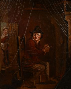 19th Century Dutch School. An Interior Scene of a Man Filling his Pipe with a Female Figure beyond, Oil on Panel. 8.75" x 7.25".
