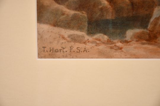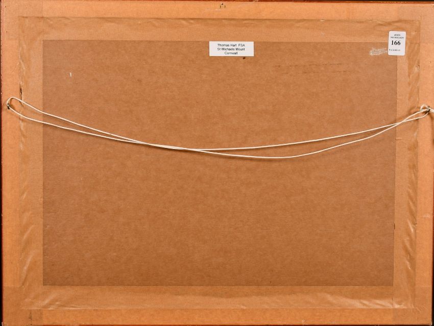 Thomas Hart, F.S.A. (fl.1865-1880 d.1886) British, A coastal scene of figures at St. Michael's Mount crossing a path to a castle beyond, watercolour, signed, 9" x 14.5".