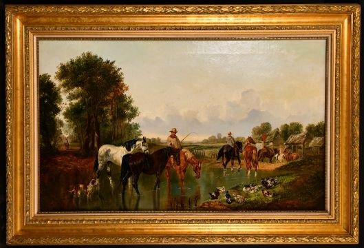 Circle of John Frederick Herring Jr. (1820-1907) British, A scene of drovers taking horses across a stream with farm buildings beyond, oil on canvas, 22" x 36".