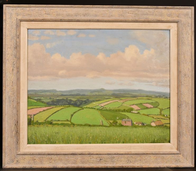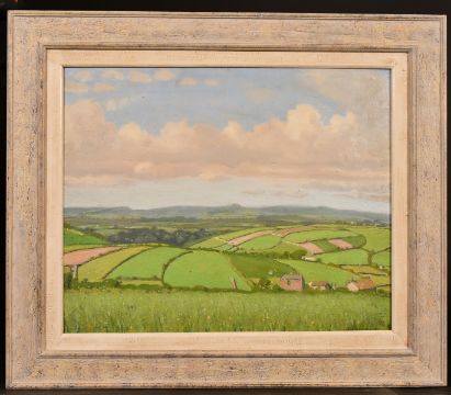 Robert Morson Hughes (1873-1953) British, A view of farmland with wildflowers in the foreground, oil on board, 13" x 16".