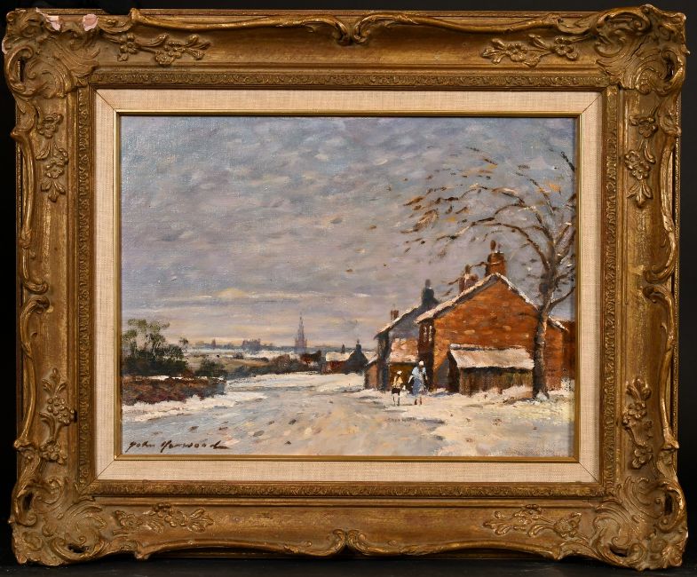 John Hammond Harwood (1904-1980), British, figures walking in the snow at dusk with a church beyond, oil on canvas, signed, 12" x 16".