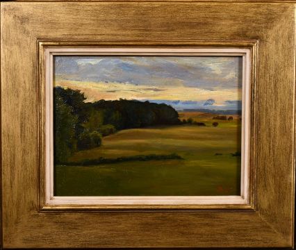20th century school, An extensive tree lined landscape at dusk, oil on board, signed with initials M.S. 9" x 12".