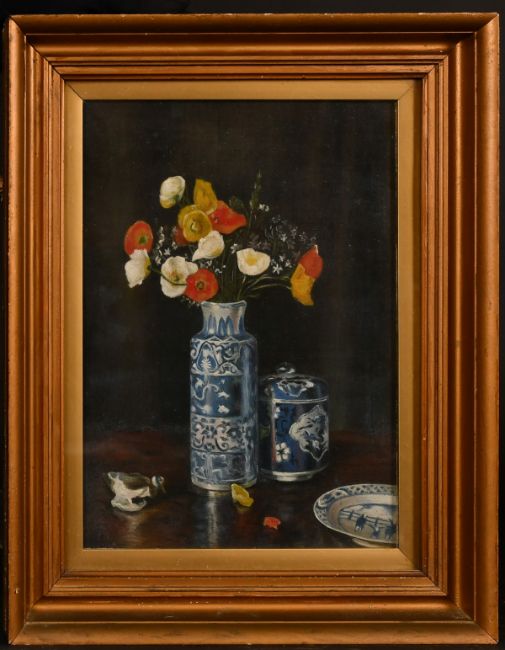 Late 19th/early 20th century school, A still life of flowers, in a blue and white oriental vase, oil on canvas, 11"x 8".