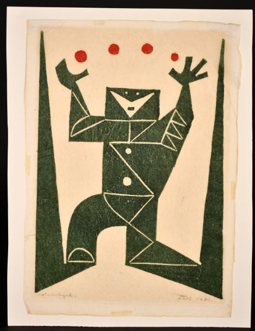 20th century Continental School, an abstract of a figure juggling, lithograph, indistinctly signed in pencil and dated '1951', 14" x 10.5".