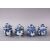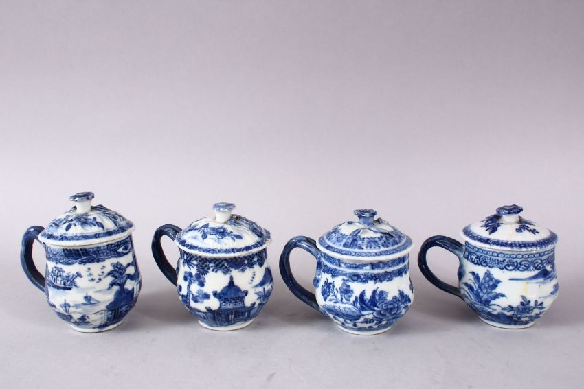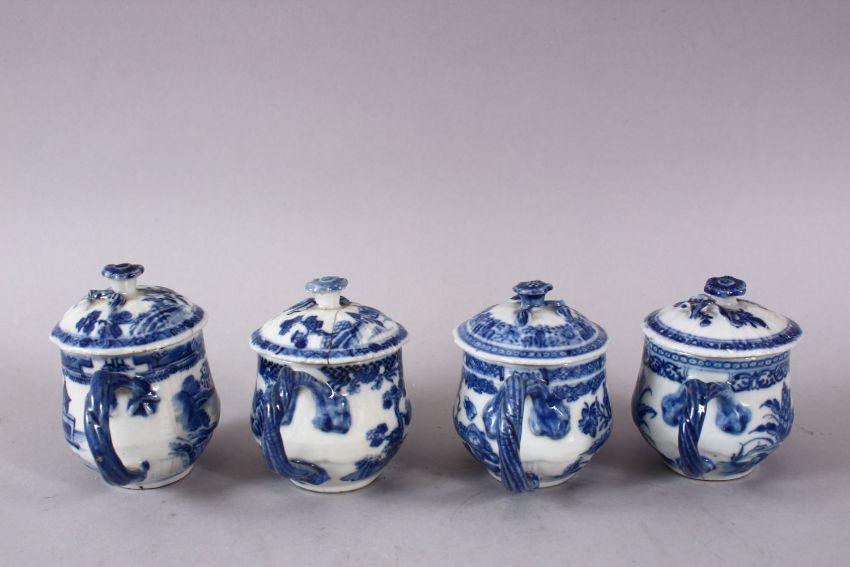 A SET OF FOUR 18TH / 19TH CENTURY CHINESE BLUE & WHITE PORCELAIN CUDDLE CUPS & COVERS, each painted with native landscape views, with floral moulded finial's, 8.5cm high.