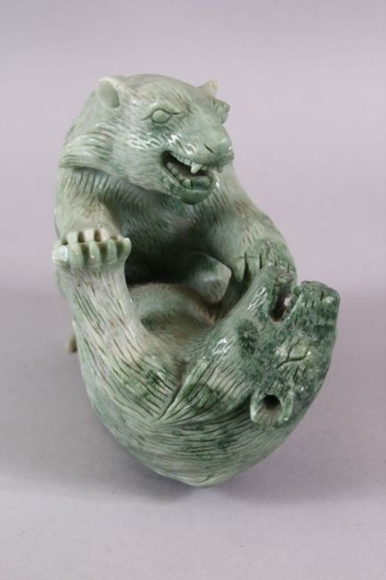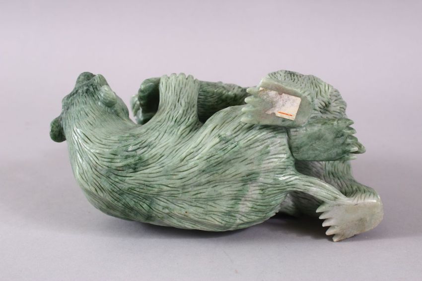A CHINESE CARVED GREEN HARD STONE MODEL OF TWO PLAYING BEARS, 14cm high x 18cm wide.