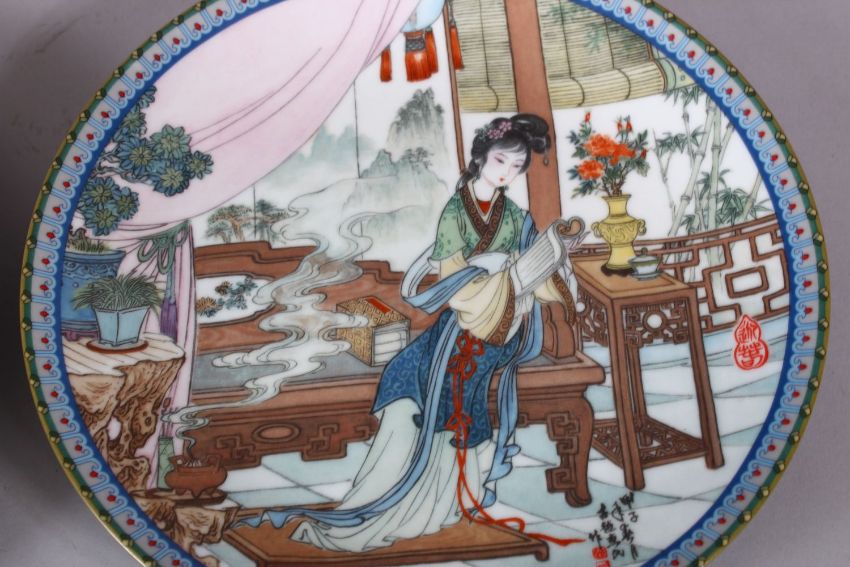 EIGHT CHINESE FAMILLE ROSE PORCELAIN PLATES, four decorated with female figure decoration, four with landscape views, each bearing calligraphy to the verso, 21cm.