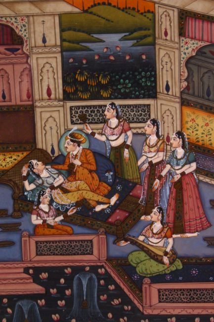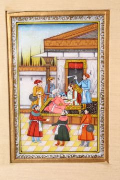THREE INDIAN SCHOOL FRAMED MINIATURE PAINTINGS - ONE ON MARBLE, the marble depicting scenes of figures in a garden setting, One of a romantic interior scene, the other of a blue skin god in a garden with the sacred cow. (3)
