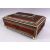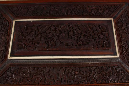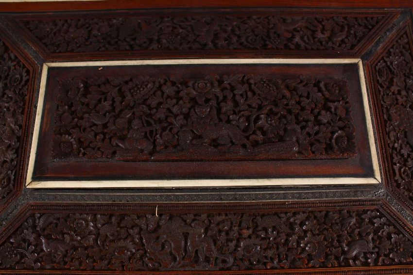 A 19TH CENTURY ANGLO INDIAN INLAID LIDDED SEWING BOX, with carved wood depicting figures and animals amongst foliage, with micro mosaic inlay with ivory banding, the interior with ivory implements and carved wooden boxes, on four carved ball feet, 45cm wide x 30cm deep x 19cm high.